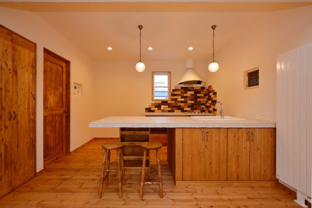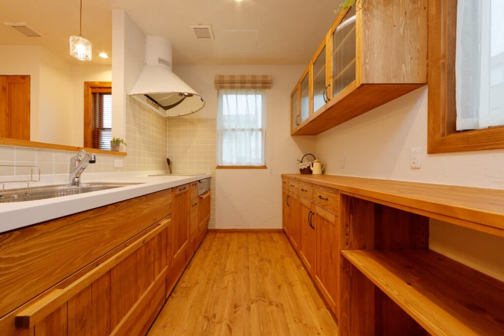 このキッチンや室内の扉、床材などは無垢の木材を使った、建具・家具の職人さんや大工さんの造作です。
