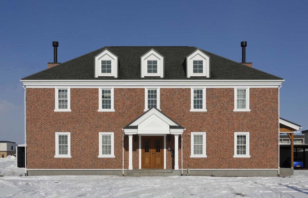 アールに仕上げたレンガの玄関ポーチや、ドーマー窓が並ぶ大屋根、白いモールディングとのコントラスト。奥様が長年、住宅雑誌などを見て、想い描いてきた家が、そのまま形になりました。