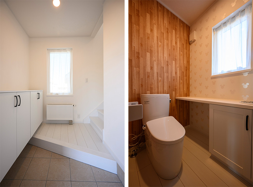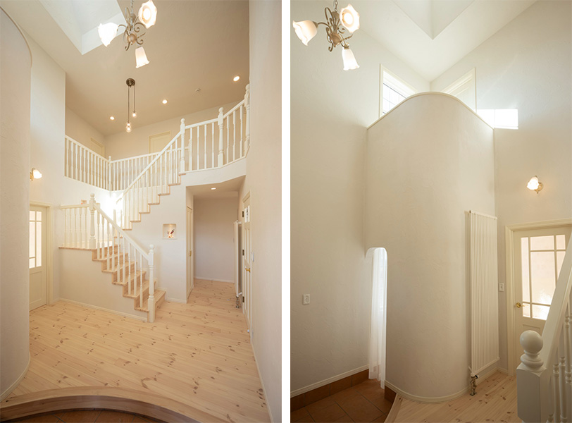 「ご近所の方に家を褒めていただくことが多いので、私たち、そして両親も喜んでいます。玄関ホールは、吹き抜けになっていて正面の階段や、シューズクローゼットのRの壁、全面の塗り壁などが特に好評です」