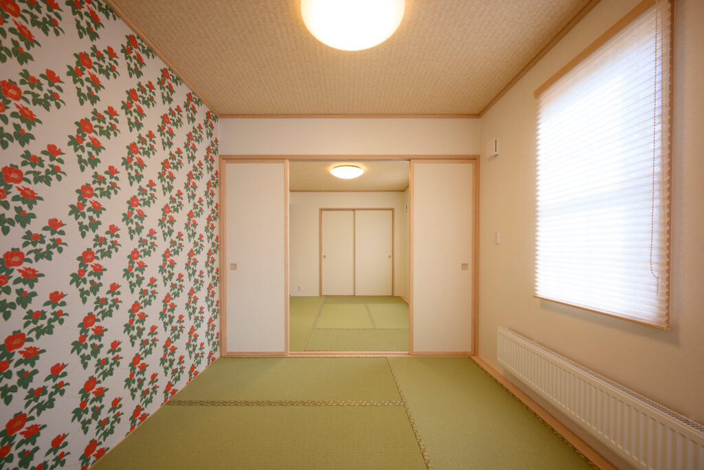 和室は花柄のクロスと青畳の組み合わせで、続き間にするとゆったりとした広さになります。仏壇を配置し、親戚が集まったりする空間としても役立っています。引き渡し後の新築祝いには近所の農家さんや親族がおよそ70人も駆けつけ、盛大な集まりになりました。「この地域では家を新築した際、知人やご近所さんをお招きして、お食事をふるまったりする慣習があって、私もお邪魔したことがあり、両親も、同じようにしたいと話すので、今回、我が家もお招きしました」