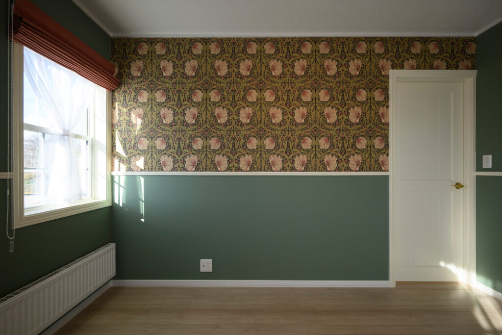 奥様が長年憧れていたウィリアムモリスのピンパーネル柄。同じくウィリアムモリスの深いグリーンの壁紙とコーディネートして奥様の寝室におさまりました。