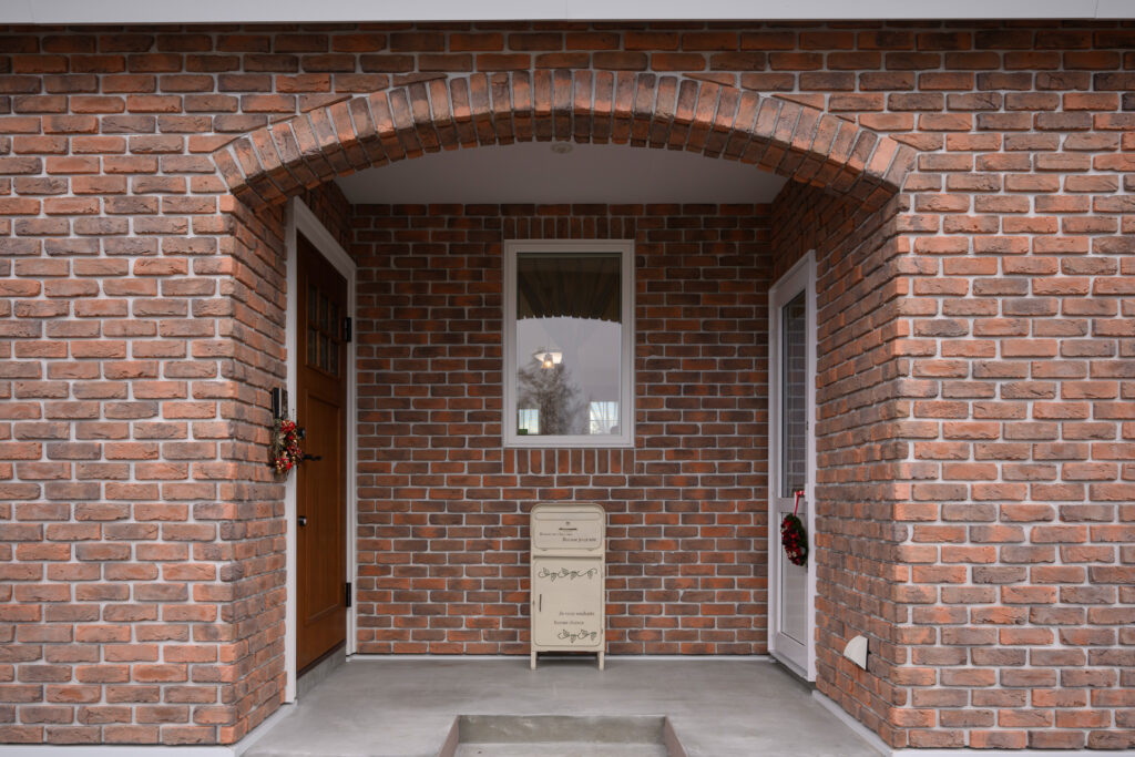 息子さん宅の玄関や裏口がある北側のポーチもレンガをアールに貼って仕上げています。