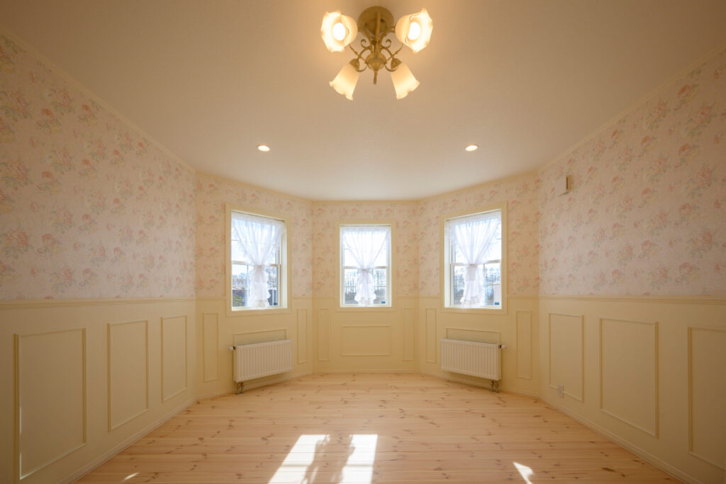 塔の内側に位置する八角形の部屋には、淡いフローラル柄の壁紙と白いモールディングの腰壁が広がり、花びらを模した照明がやわらかく灯ります。