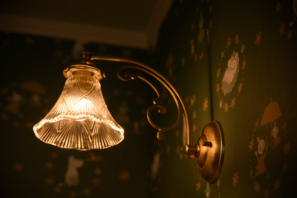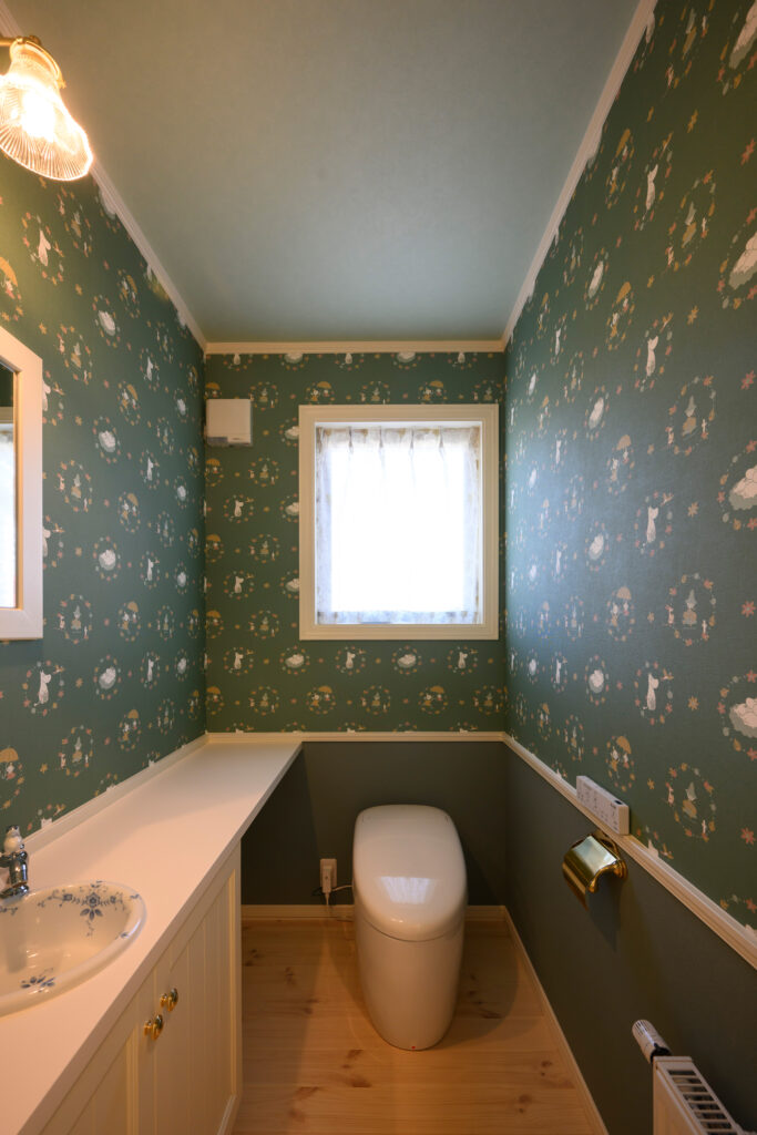 1階のトイレは奥様の大好きなムーミンの壁紙、ガラス製の照明がとても似合います。