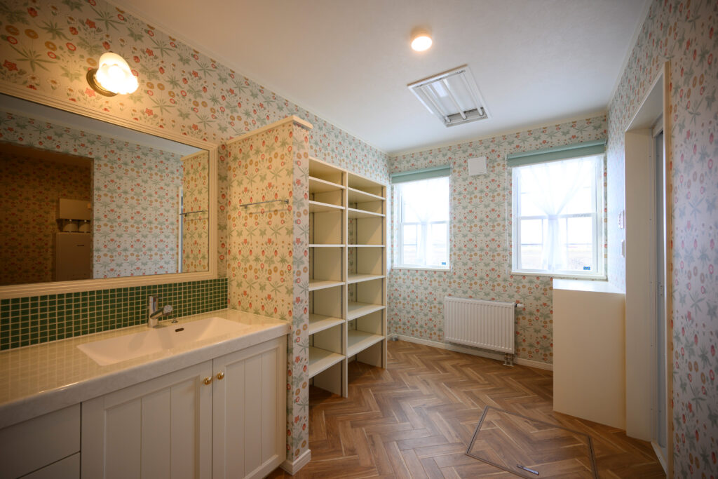 洗面室はウィリアムモリスのデイジーという植物柄の壁紙を。緑のモザイクタイルや造作の収納など細部にこだわりがあります。